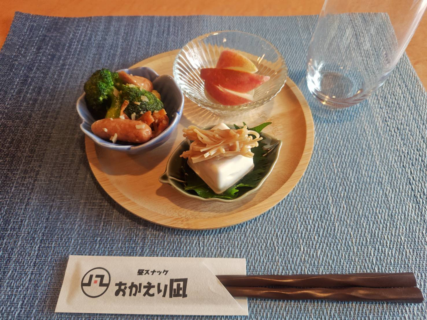 ブロッコリーとウインナーのにんにく炒め、なめ茸冷奴、りんご