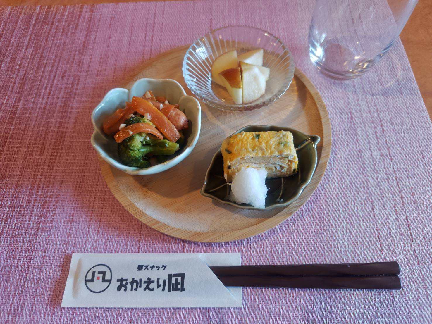 ブロッコリーとウインナーのにんにく炒め、だし巻き玉子、りんご