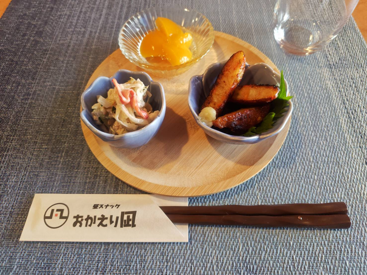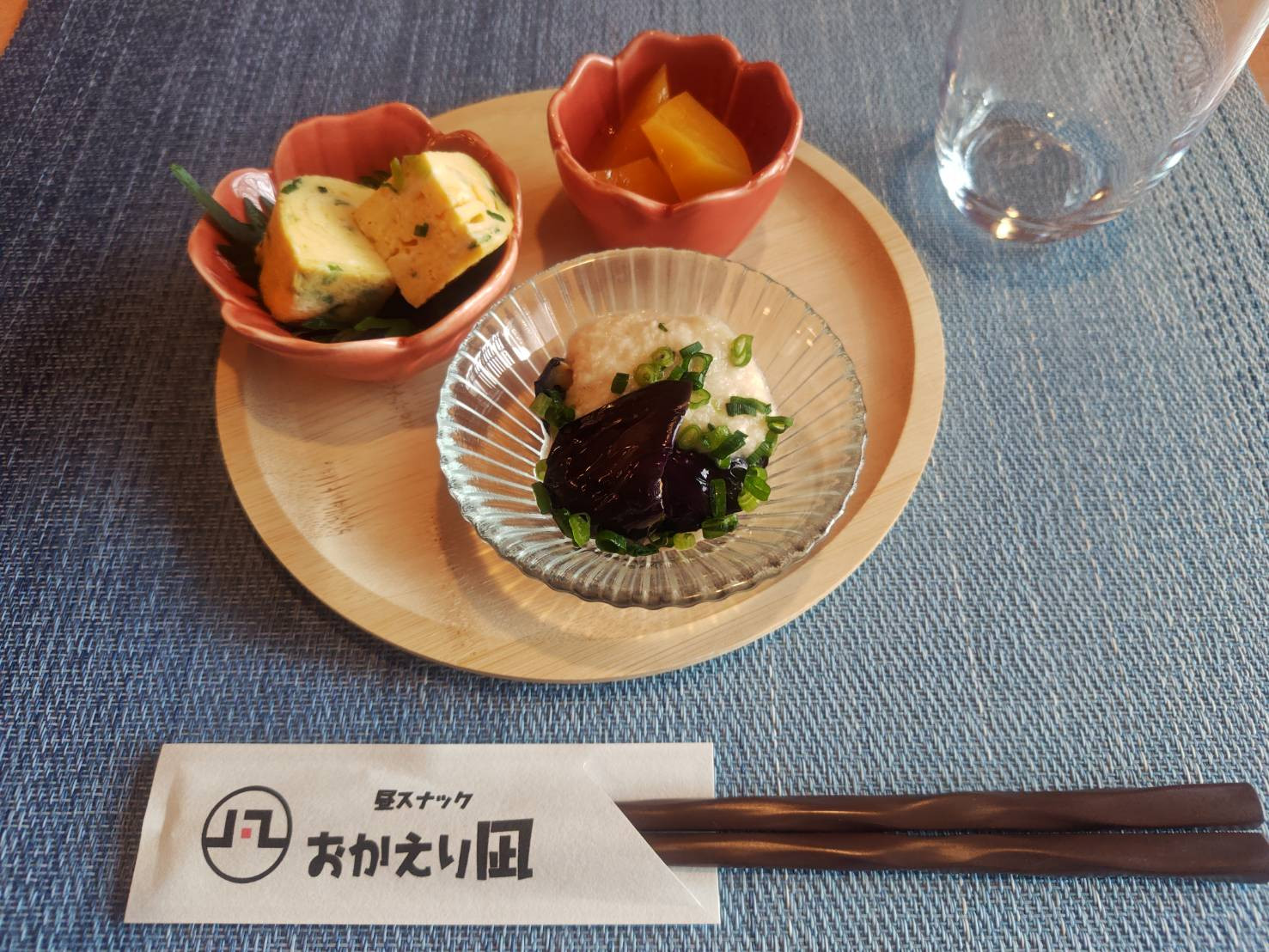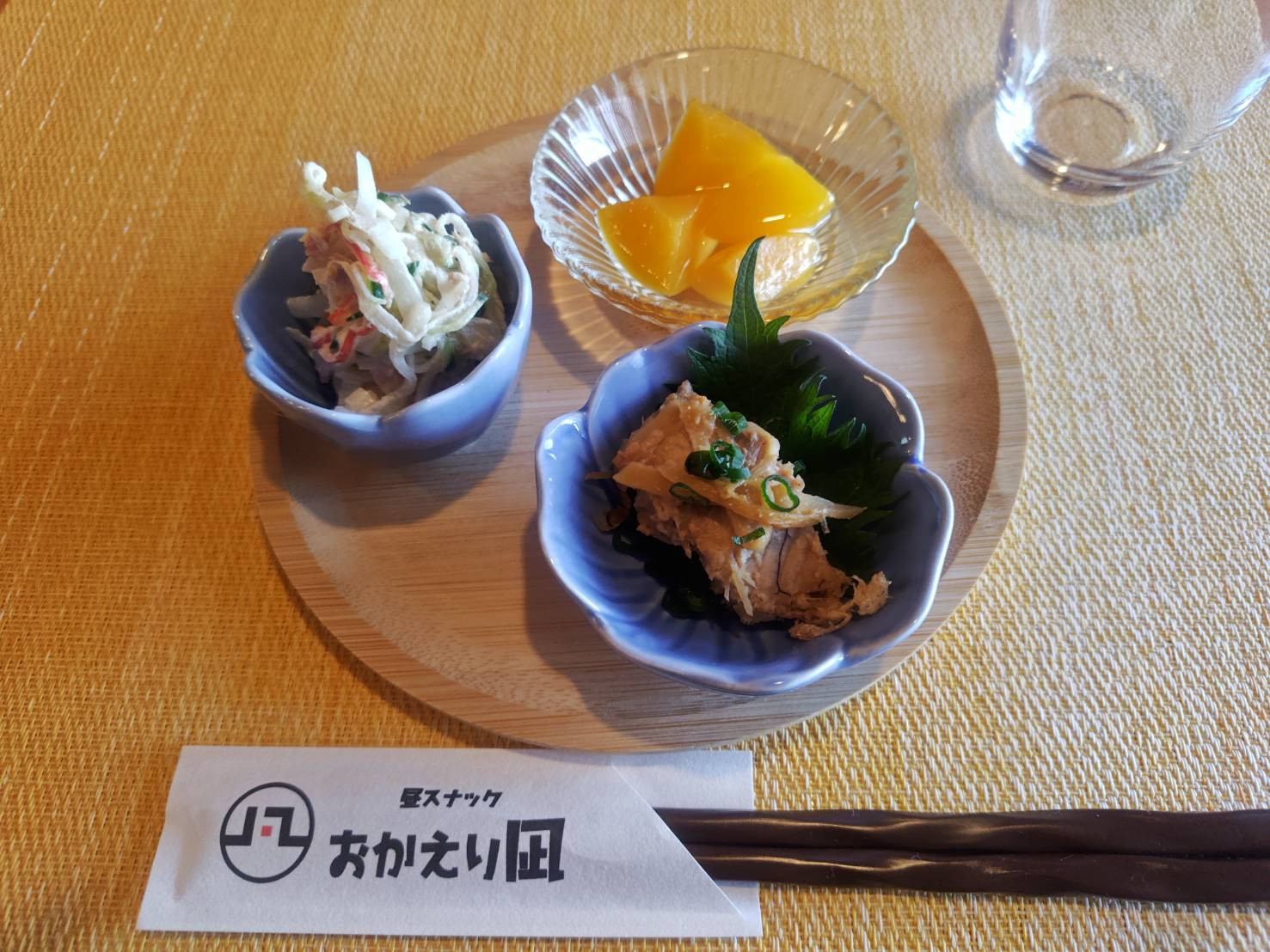 揚げなすの山かけ、だし巻き玉子、黄桃