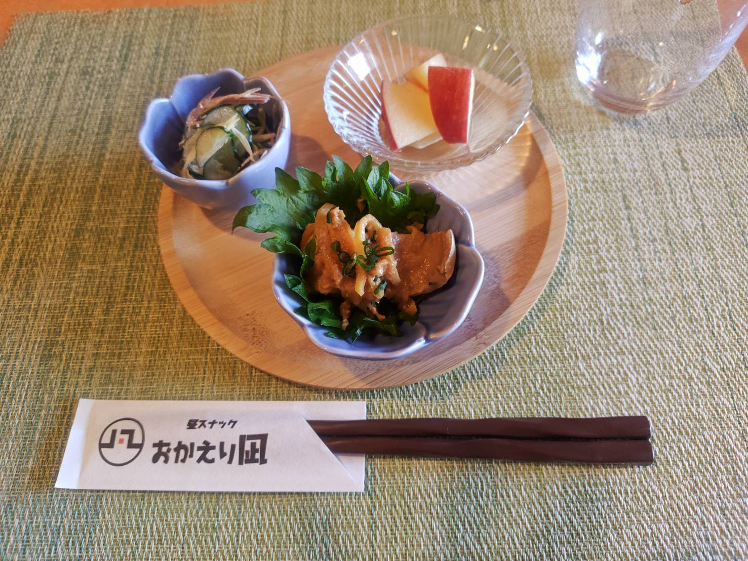 餅巾着、ちくわきゅうり、りんごと黄桃