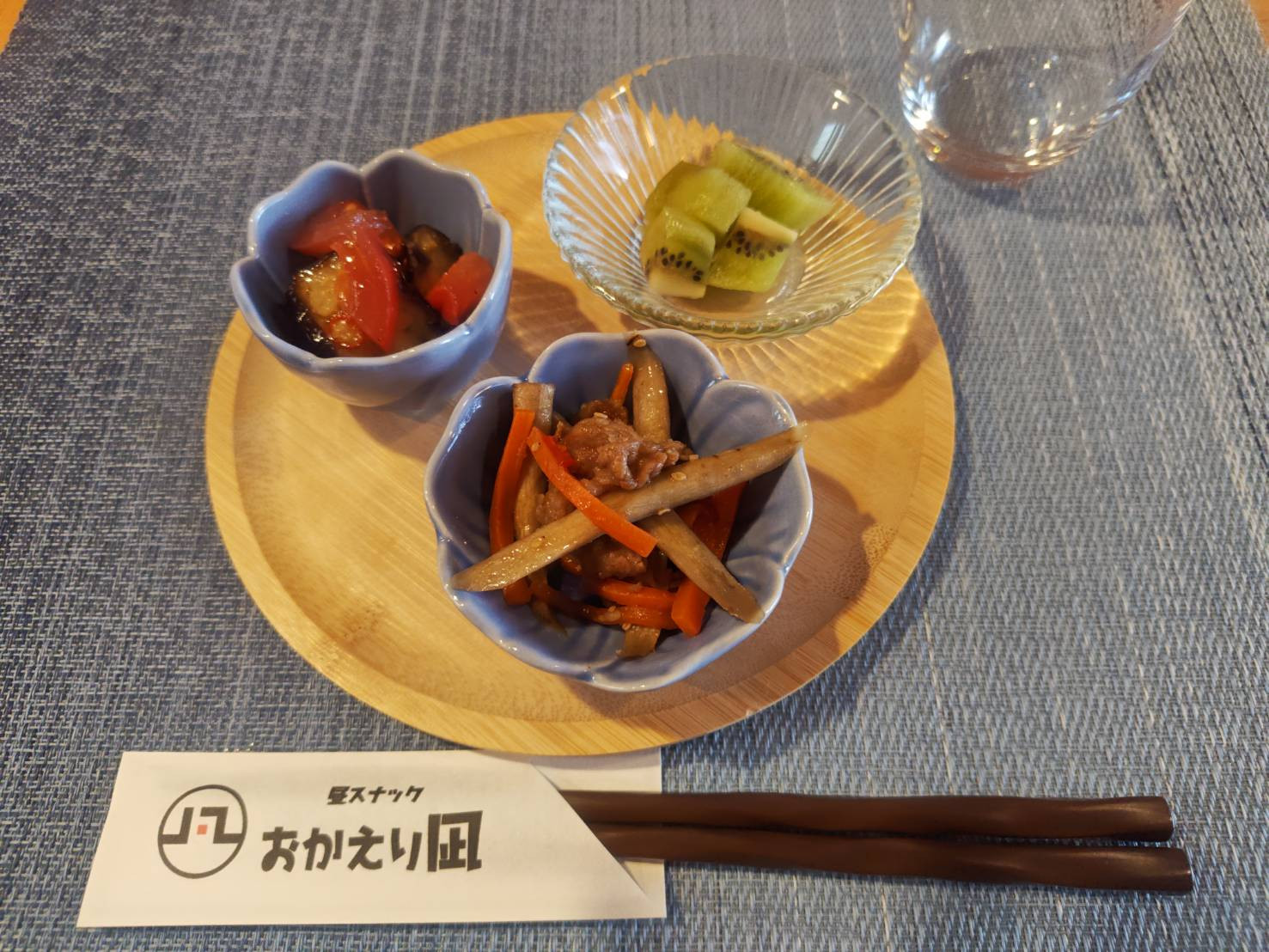 牛肉とごぼうの甘辛炒め、揚げなすとトマトのマリネ、キウイ