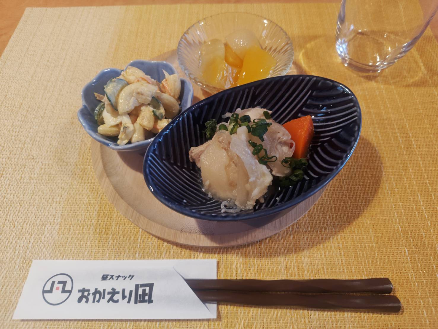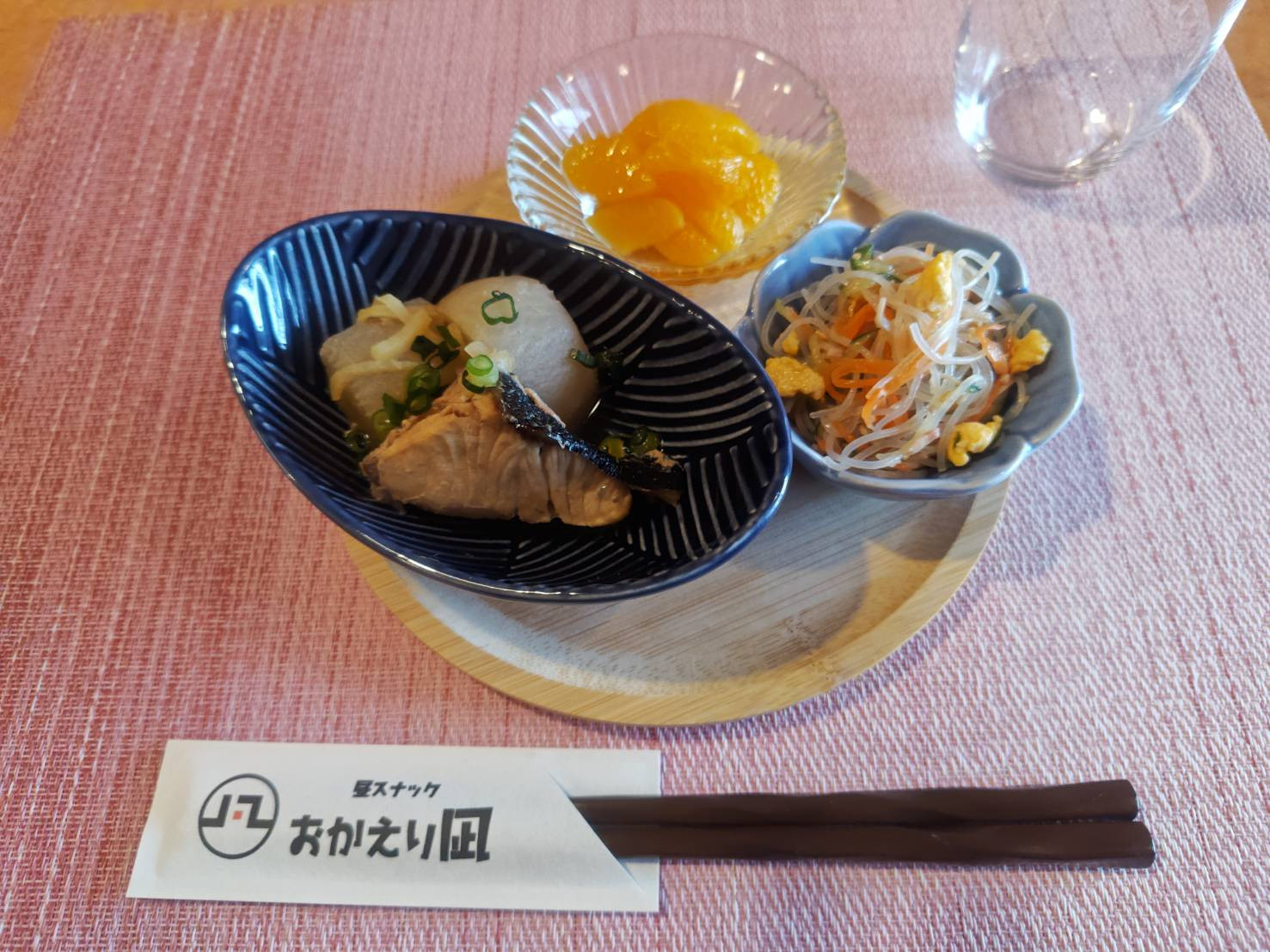 ぶり大根、中華春雨サラダ、みかんと黄桃