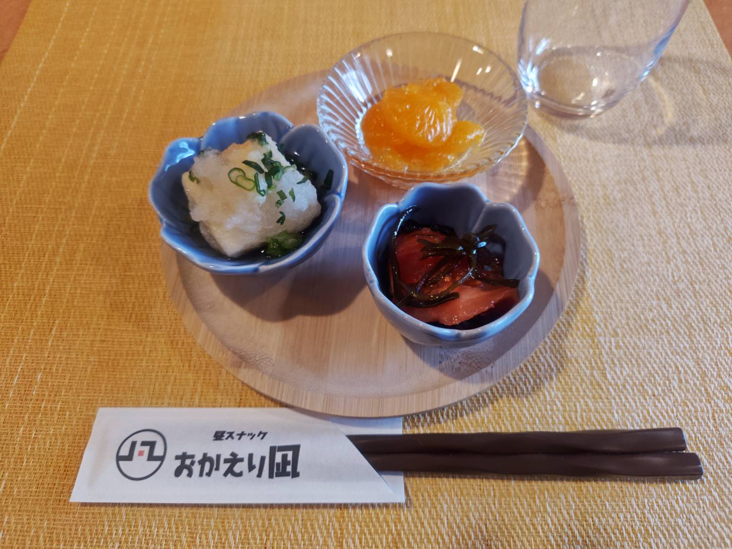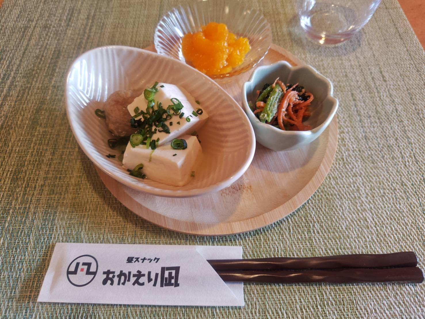 揚げ出し豆腐、めかぶと山芋の和え物、りんごとみかん