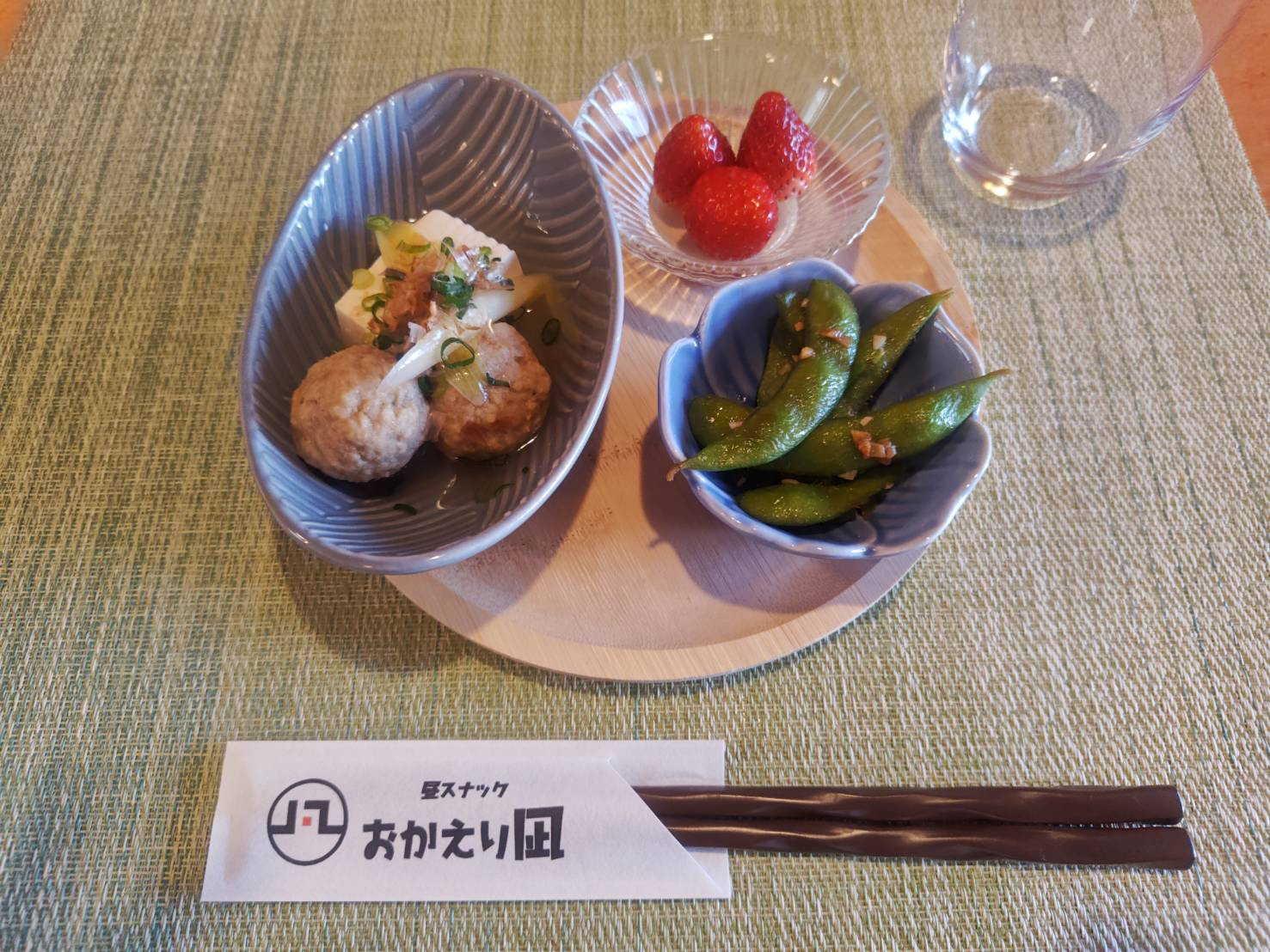 肉団子入り湯豆腐、ガーリック枝豆、いちご