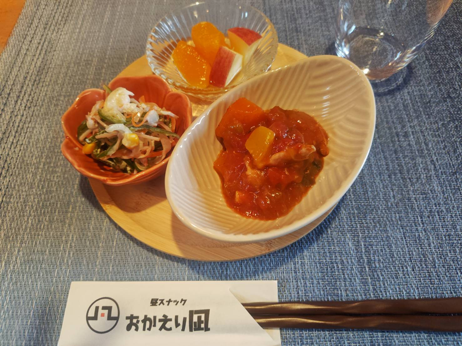 鶏肉のトマト煮、ピーマンサラダ、りんごとみかん