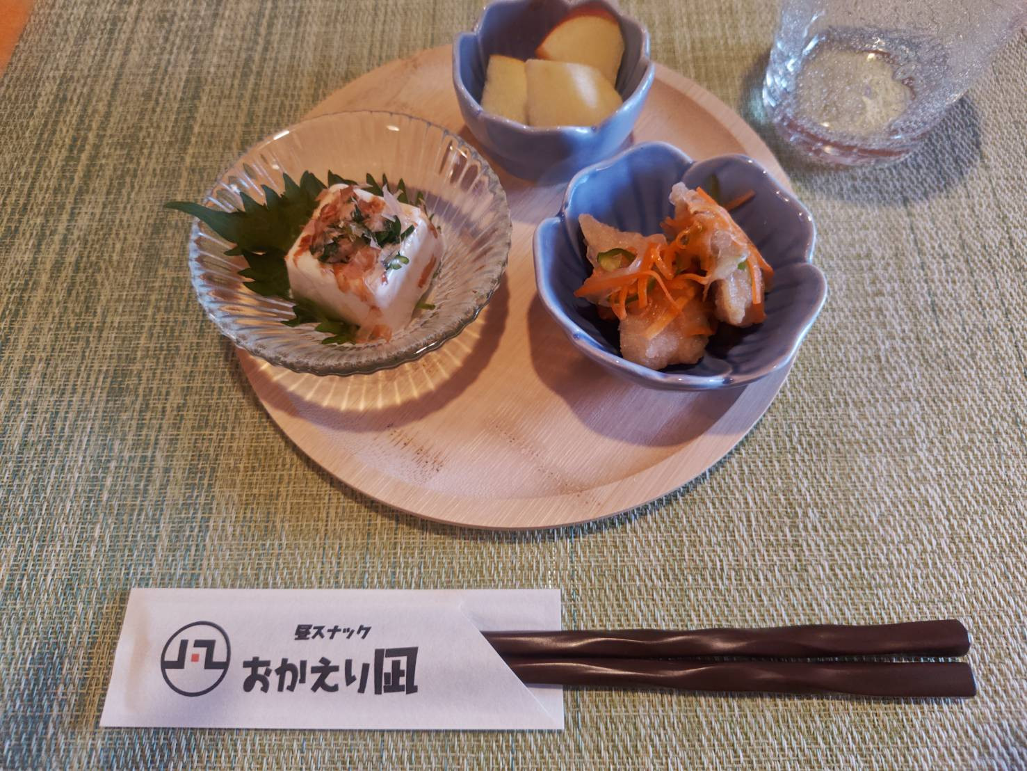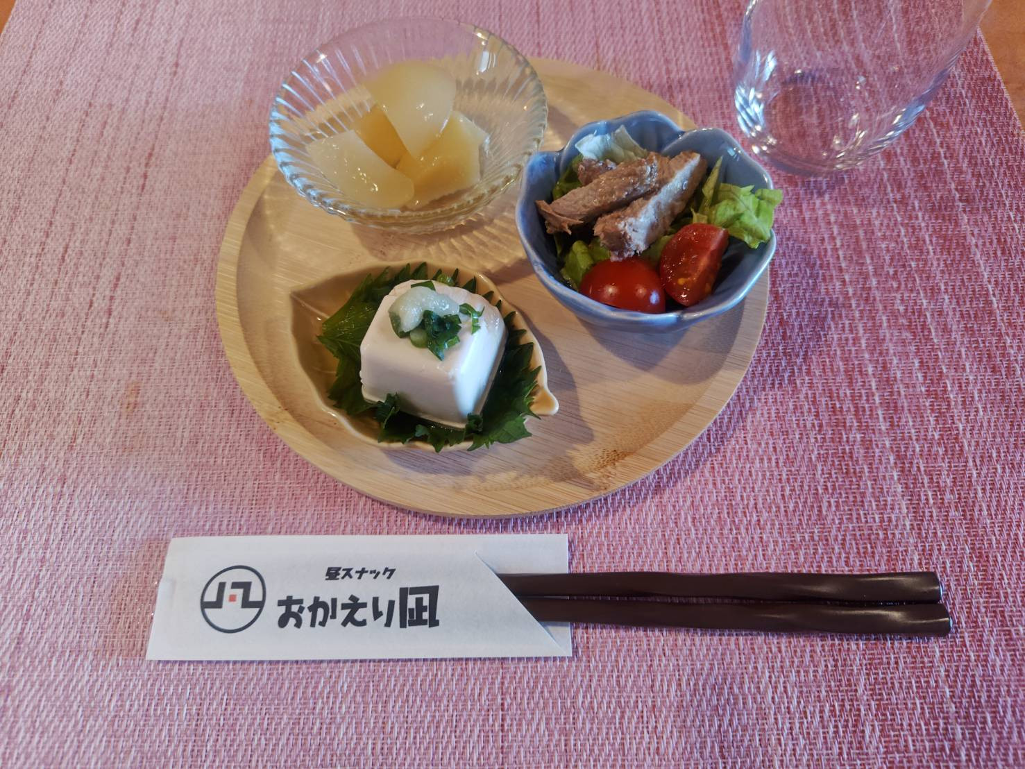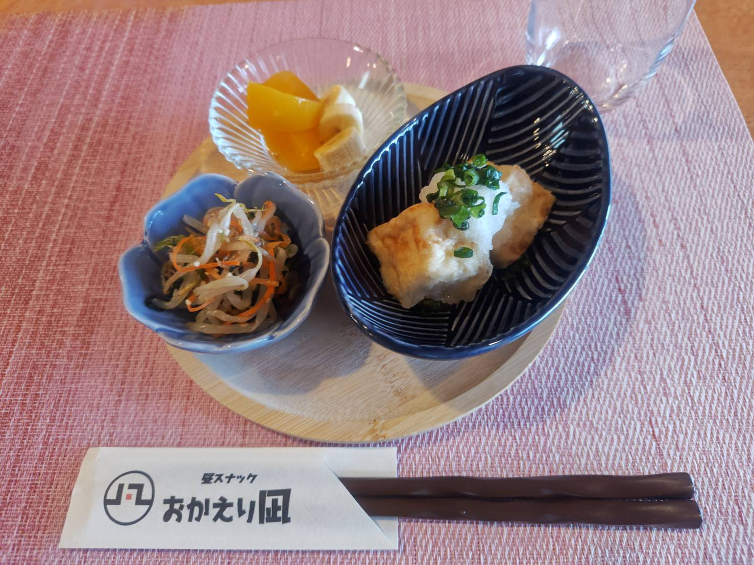 揚げ出し豆腐、野菜のナムル、バナナと黄桃