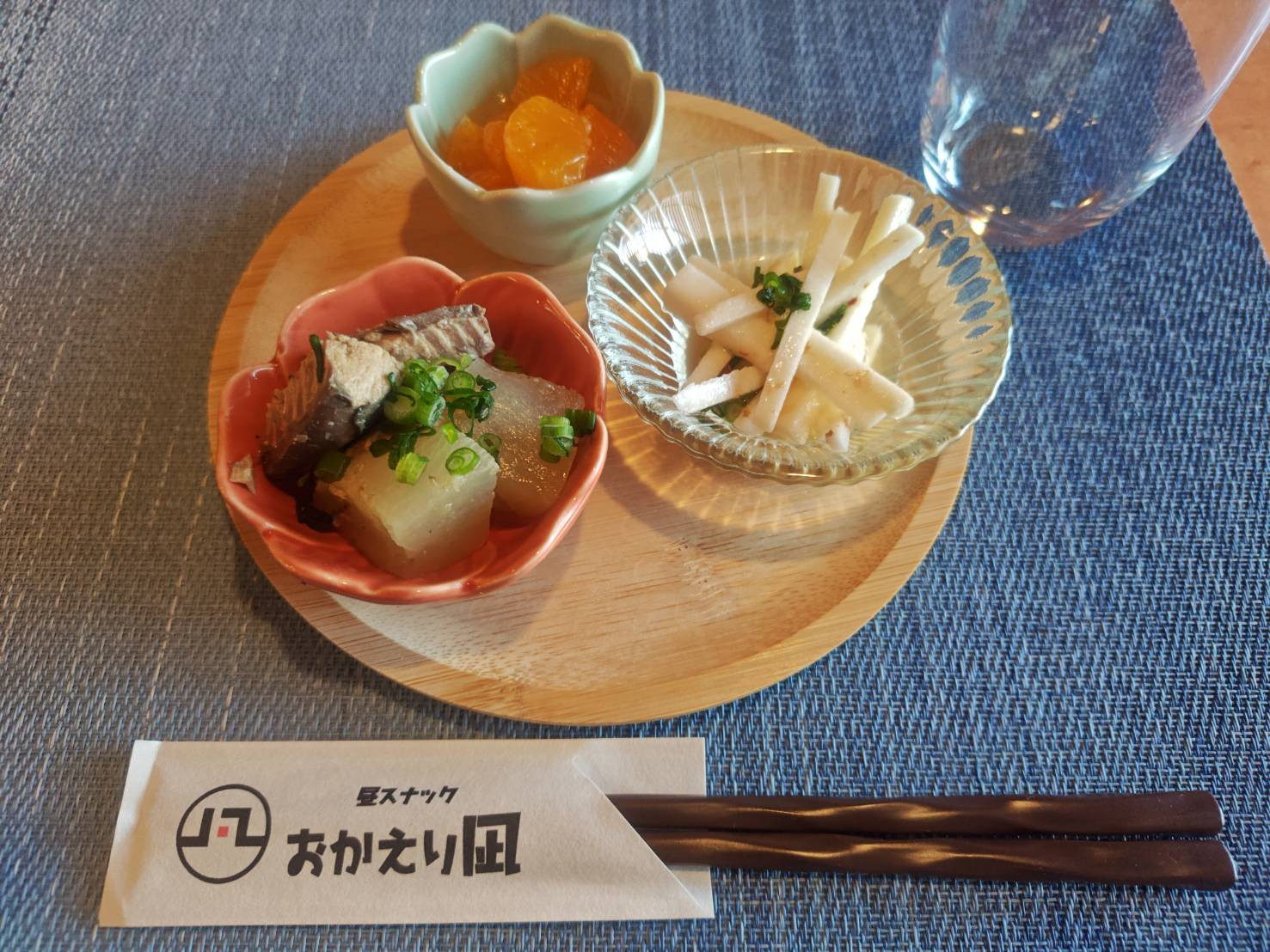 餅巾着と大根の煮物、なすの煮浸し、みかん