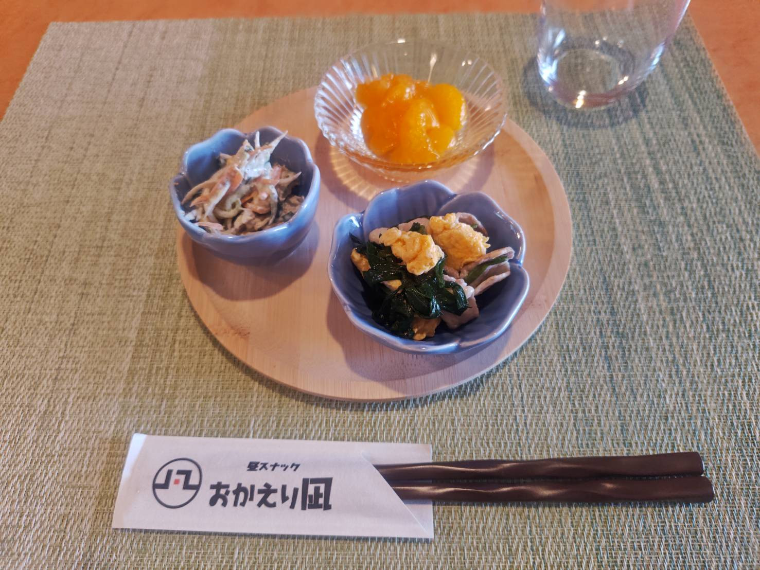 ほうれん草と切り干し大根のナムル、シュウマイ、キウイと柿